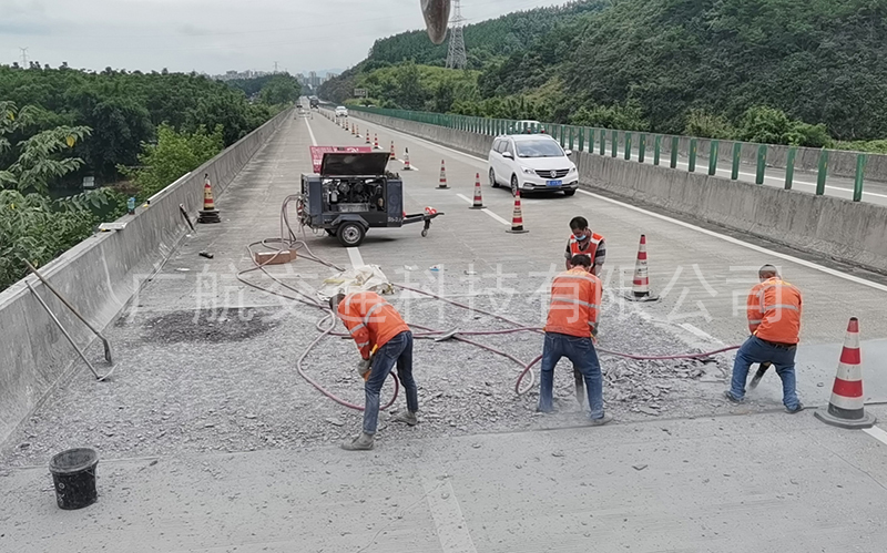 修補尺寸分別為寬5米,長6.7米,經過勘測,破損主要集中在混凝土表面,需要先將破損處鑿除,再用快干水泥與路面澆筑平整,從施工圖可以看出,修補的厚度不高,是一個典型的表面破損路面修補案例,對快干水泥的粘接力和抗壓強度都有很高的要求,否則很容易造成路面的二次破損。